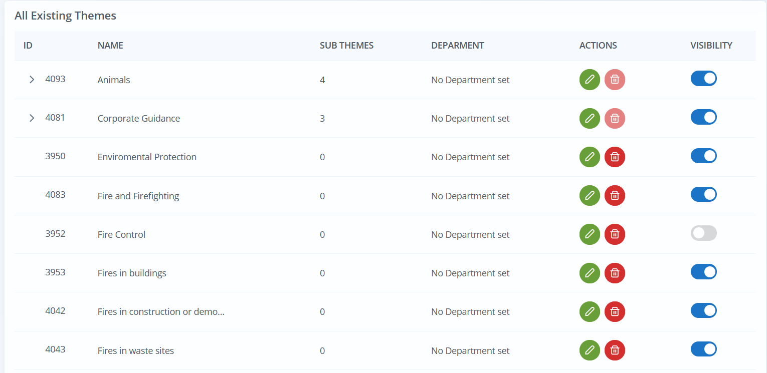 A service may have historic themes that were created during early onboarding or during a previous reporting approach. These may still be linked to older incidents, debriefs, or tasks, so deleting them would not be appropriate.